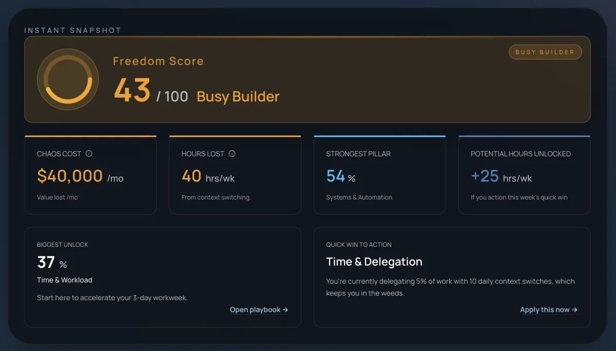 The Freedom Scorecard helps you see your business clearly — what’s working, what’s draining you, and how close you are to the freedom you started this for.